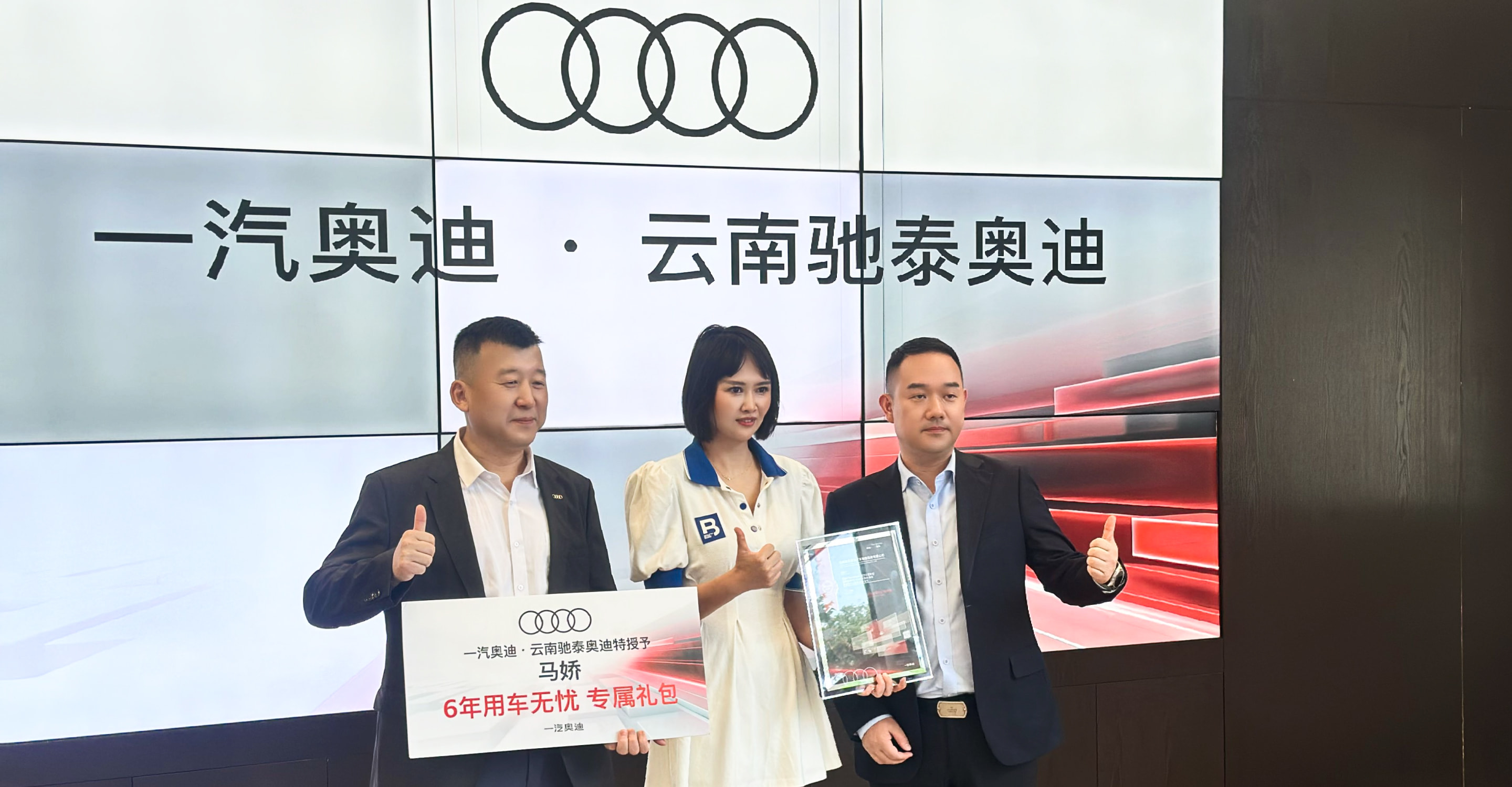 一汽奥迪向马娇女士赠予“6年用车无忧专属礼包”,以表达对其公益热忱的敬意。