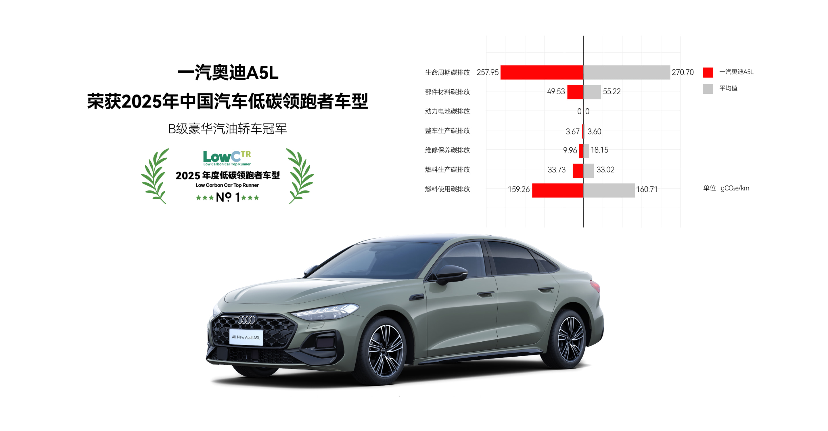 一汽奥迪 A5L 荣获2025年中国汽车低碳领跑者车型