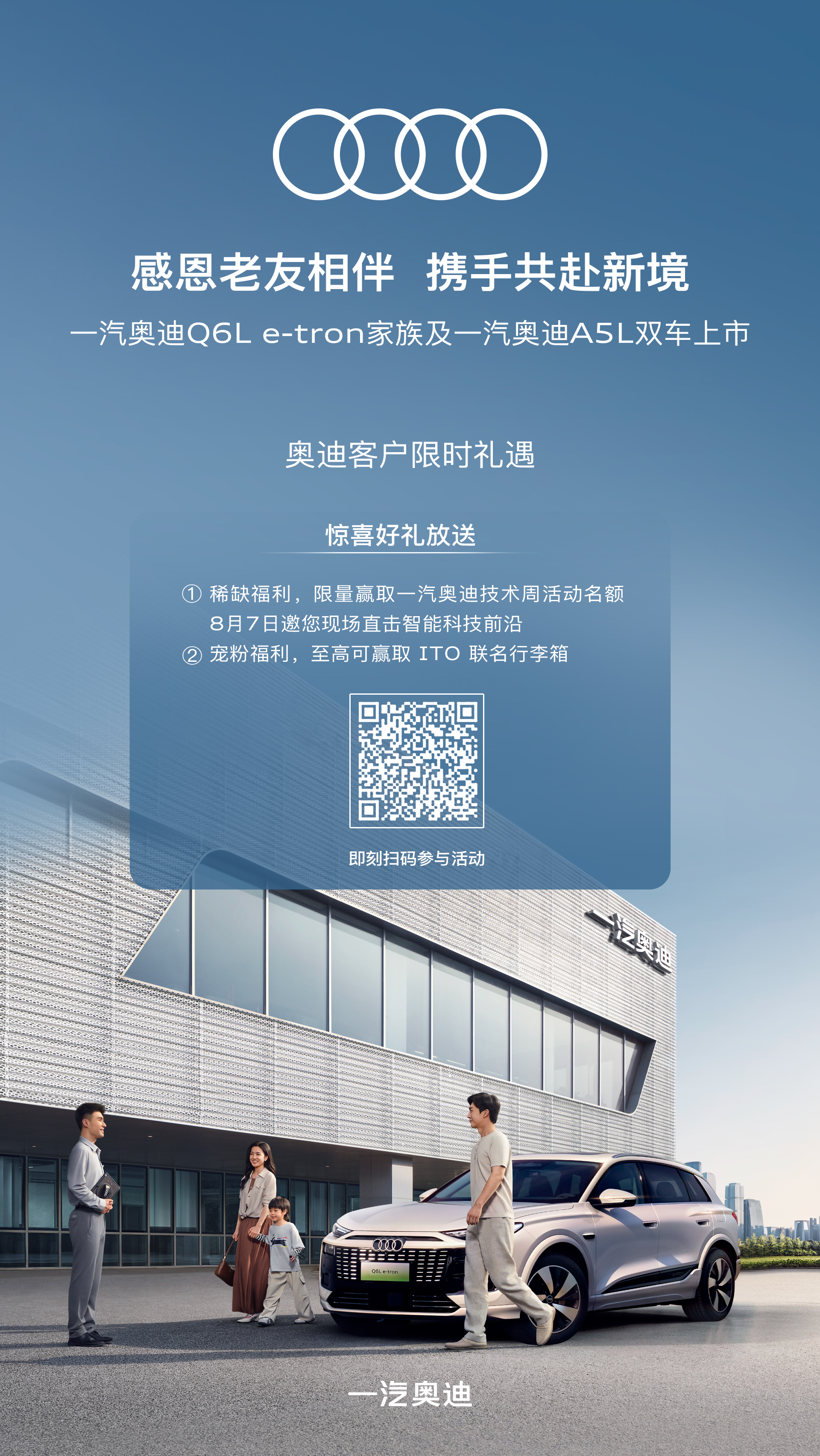 此外,迄今近千万累计用户的信赖与陪伴,始终是一汽奥迪不断前行的强大动力。基于此,一汽奥迪推出“双车焕新 礼暖老友”感恩回馈活动:即日起至8月10日,一汽奥迪 App 认证车主线上预约到店品鉴或推荐购买一汽奥迪 Q6L e-tron 家族或一汽奥迪 A5L,即可解锁专属盲盒,包括“一汽奥迪科技周活动名额”惊喜奖,以及 ITO 联名行李箱等重磅好礼;诚邀广大用户莅临品鉴,共同见证科技豪华的全新实力。