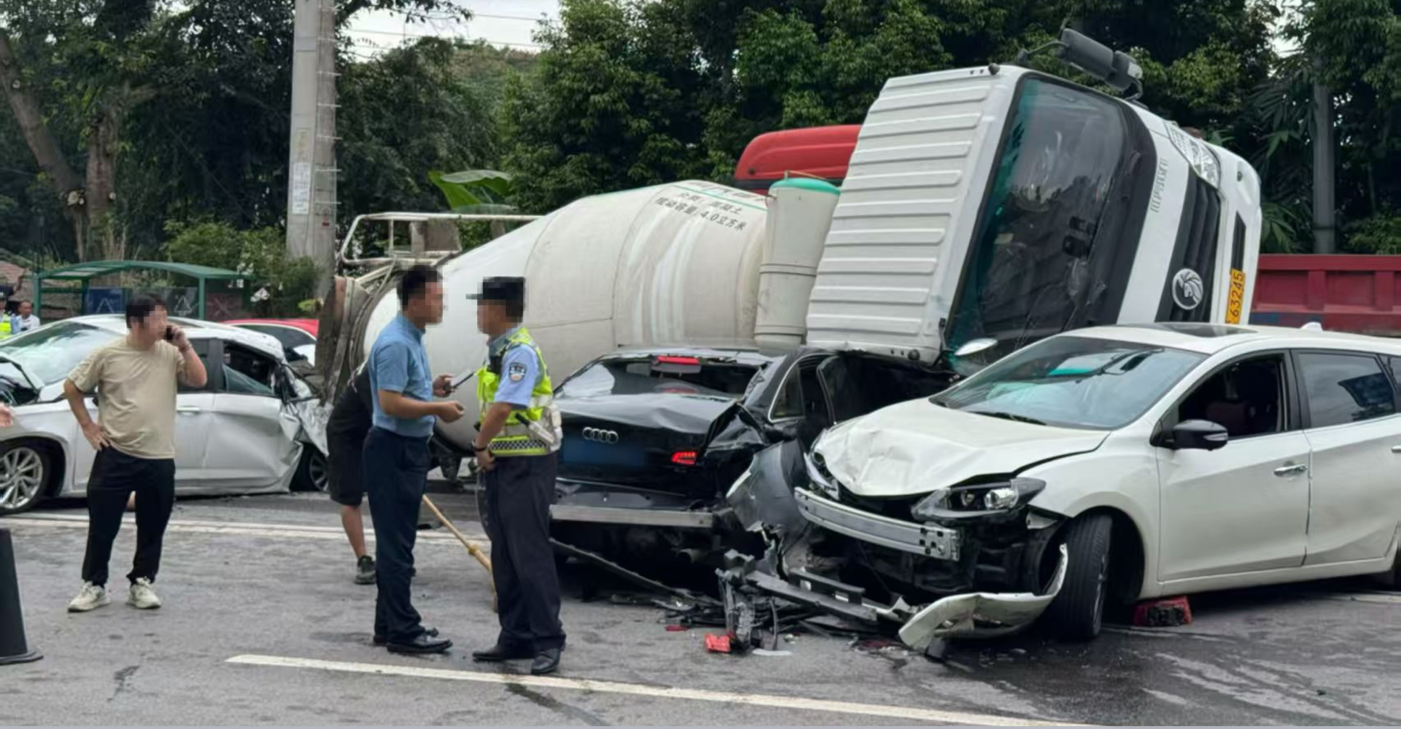 9月26日四川自贡严重交通事故现场,一辆水泥罐车突然侧倾压向路口等待红灯的一汽奥迪 A6L